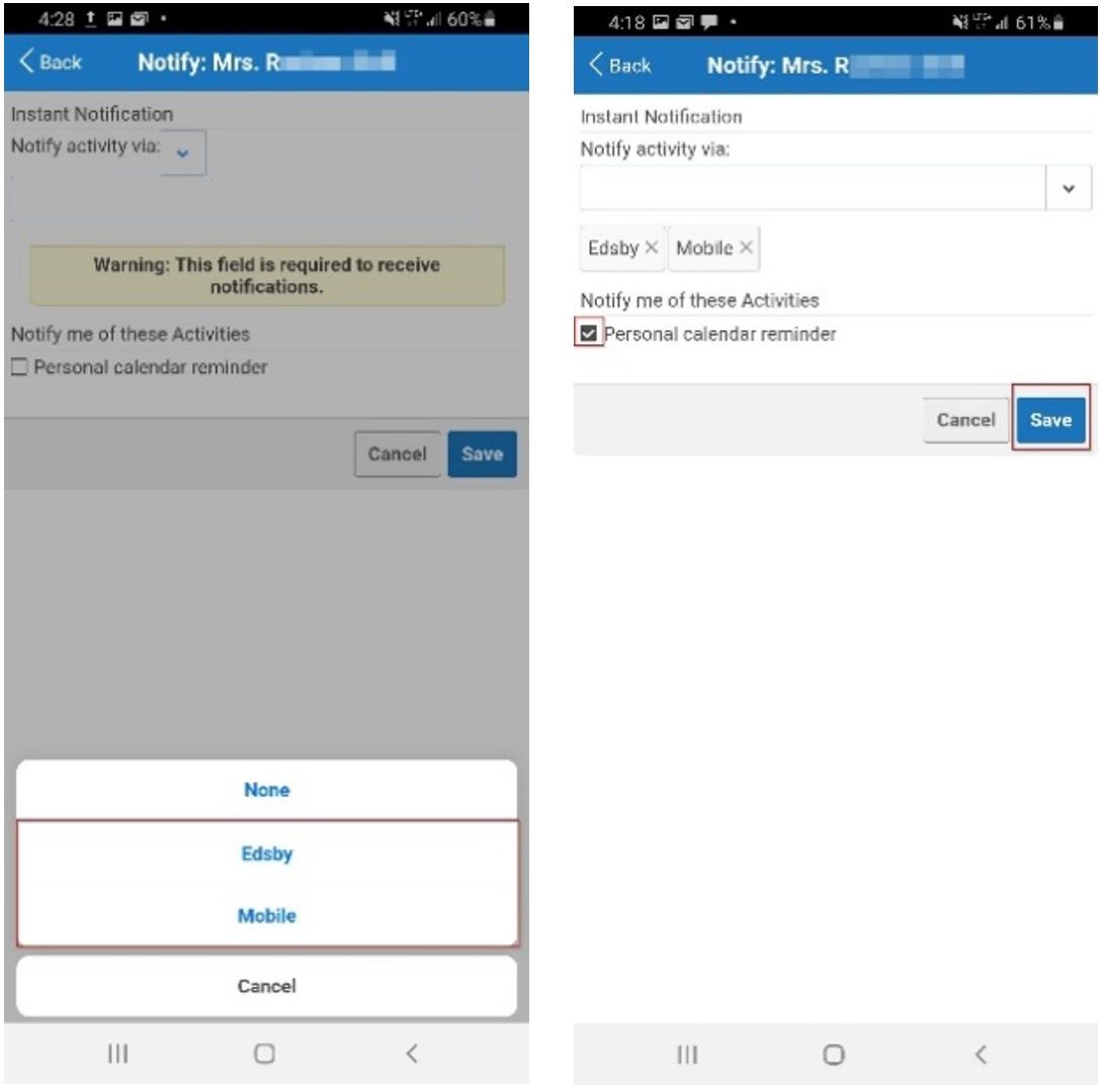 4. Choose the desired method(s) of notification (one at a time) 5. Under ‘Notify me of these Activities’ - tap the box beside ‘Personal calendar reminder’ 6. Tap Save | ![]() |