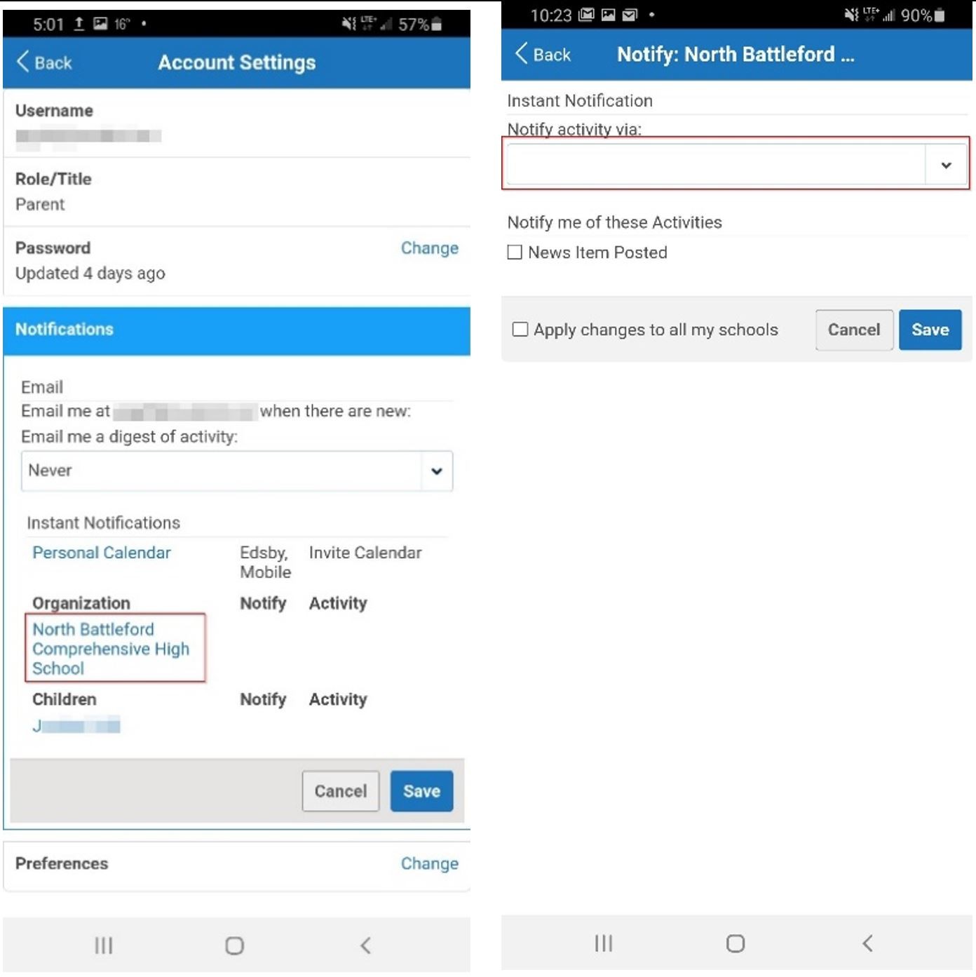3. Choose the desired method(s) of notification (one at a time) 4. Under ‘Notify me of these Activities’ - tap the box beside ‘News Item Posted’ 5. Tap the box beside ‘Apply changes to all my schools’ 6. Tap Save | ![]() |
