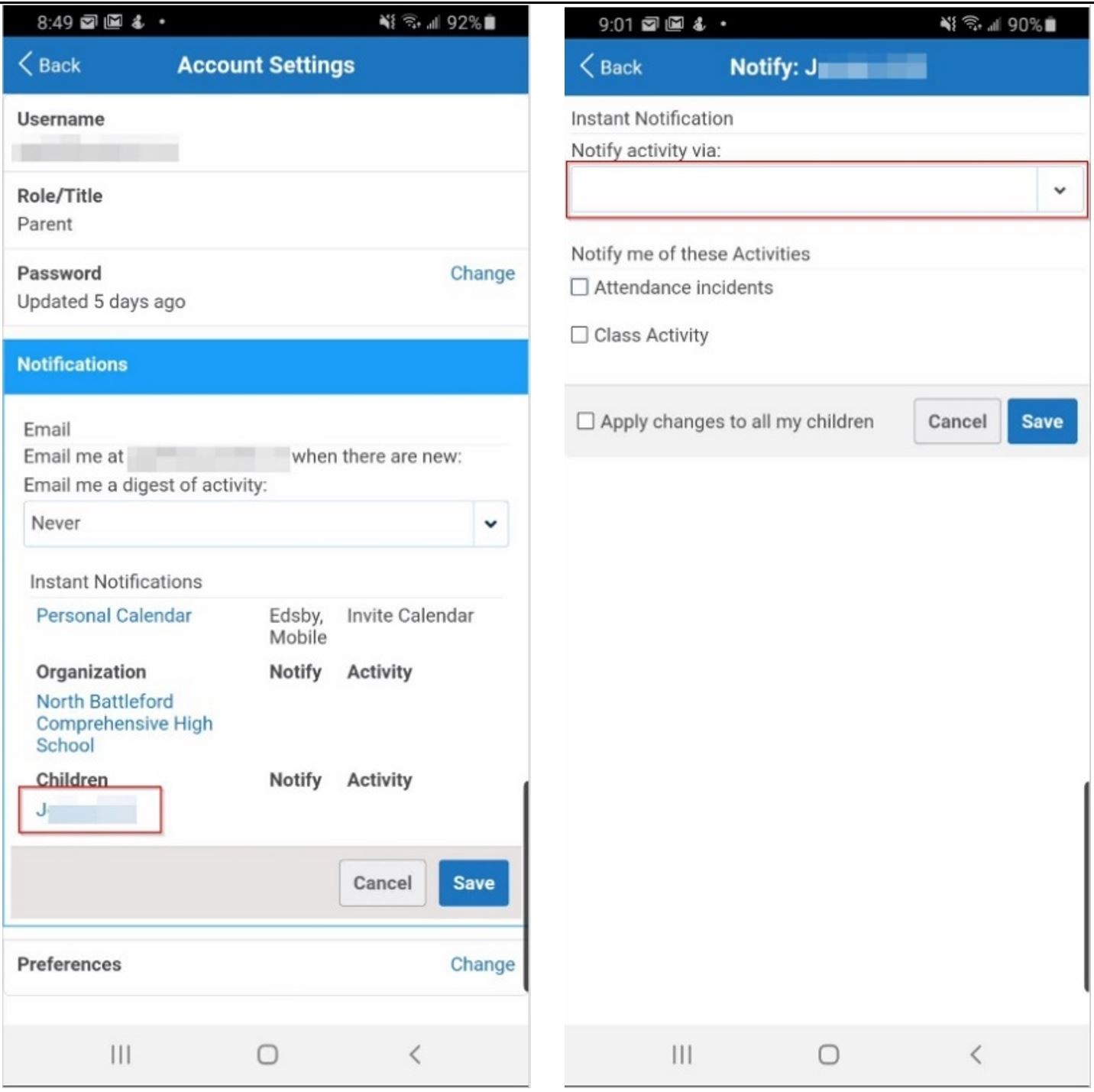 Children Notifications If ‘Attendance Incidents’ is enabled, you will receive notifications on absent attendance. If you have Class Notifications enabled on your account, you will receive notifications when teachers post within a Class. 2. Under ‘Notify activity via:’ - tap the drop down box | ![]() |