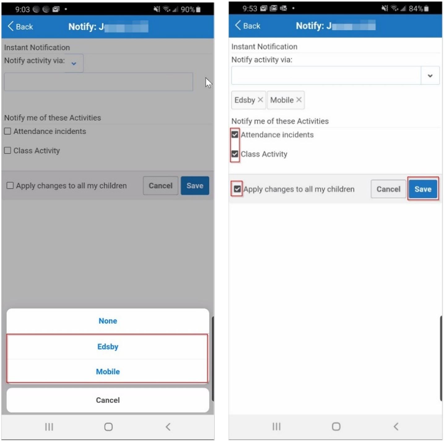 3. Choose the desired method(s) of notification (one at a time) 4. Under ‘Notify me of these Activities’ - tap the box beside the desired Activity(s) 5. Tap the box beside ‘Apply changes to all my children’ 6. Tap Save | ![]() |
